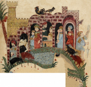 Arabe 5847, fol. 138, Maqâma 43 Abû Zayd et al-Hârith arrivant dans un village